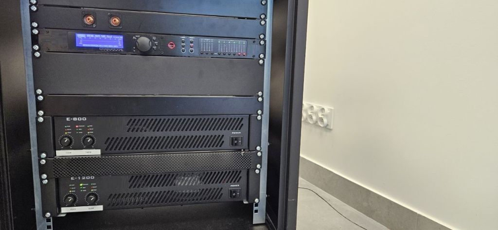 System głośnikowy został precyzyjnie dostrojony do akustyki hali za pomocą analizatora RTA i dedykowanego mikrofonu pomiarowego. Za zarządzanie systemem odpowiada głośnikowy procesor cyfrowy, który wraz ze wzmacniaczami mocy został umieszczony w centralnej szafce rack.
